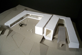 Durch die bandartige Ausformung der Baukörper entstehen zwei dreiseitig umschlossene Höfe dessen größerer eine Skiarena bildet und gleichsam wie mit einer Hand den von oben kommenden Skifahrer aufnimmt und über den anderen Hof in einer Gegenbewegung wieder nach oben befördert.