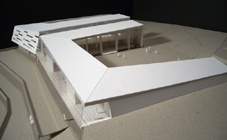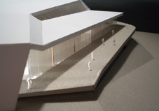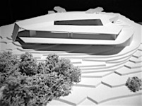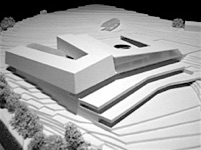 Die Dynamik der Form der Talstation setzt sich nun fort in der Bergstation auf dem Breiteckplateau. Dieser kompakte Baukörper nimmt in einer spiralförmigen nach oben leicht ansteigenden Bewegung des Daches diese gestalterische Geste wieder auf und schmiegt sich mit seiner sanften Form auf den Hügel des Breiteckplateaus.