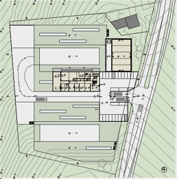 Garagen-, Manipulations- und Lagerflächen befinden sich alle auf einer Geschossebene und werden zentral über eine flache Rampe mit ca. 6% über die Landesstraße an der im Wettbewerb vorgegebenen Stelle erschlossen. Die Anordnung auf einer einzelnen Ebene ermöglicht einen optimierten organisatorischen Ablauf innerhalb der Anlage mit kurzen Wegen. Über die Zweihüftigkeiten der Baukörper wird auch eine Reduktion der Verkehrsflächen erreicht. Dadurch ist auch eine thermische Trennung der unterschiedlich temperierten Bauteile leicht möglich und wirkt sich somit positiv auf die wirtschaftliche wie auch auf die energetische Optimierung aus. Die Bürozentrale und die Sozialräume wurden mit Blick in die Landschaft über diesem Geschoss angeordnet. Ein zentrales Stiegenhaus verbindet beide Geschosse. In unmittelbarer Nähe zum Einfahrtsbereich und der Sozialräume sind 25 Parkplätze angeordnet.